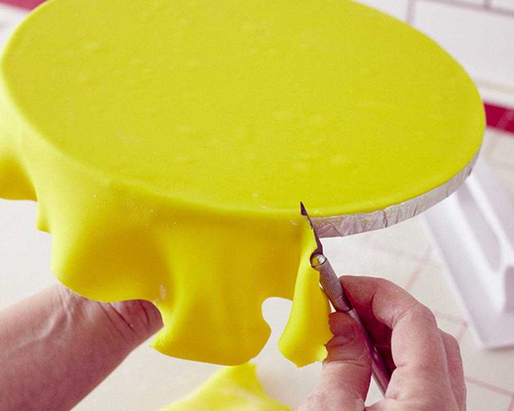 - Раскатать жёлтое мастичное тесто в тонкий блин по размеру основы, на которой будет стоять торт. Затем покрыть им форму. Остатки обрезать.