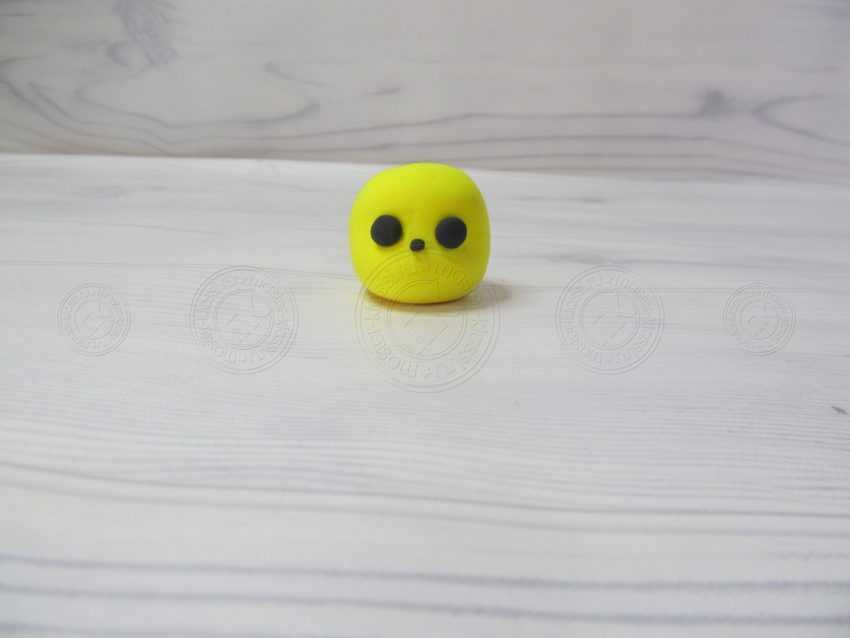 11. Сделать рот будет и того проще. Для этого просто отщипнете от черного пластилина немного ногтем и скатайте нитку и закрепите ее на голове в виде улыбки.
