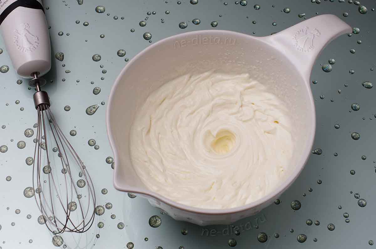 9. Теперь можно сделать очень легкий крем, который идеально сочетается с этим необычным белковым бисквитом. Для этого охлажденные жирные сливки надо взбить на максимальных оборотах миксера до получения очень густой пышной массы и ложкой смешать ее с сахарной пудрой.