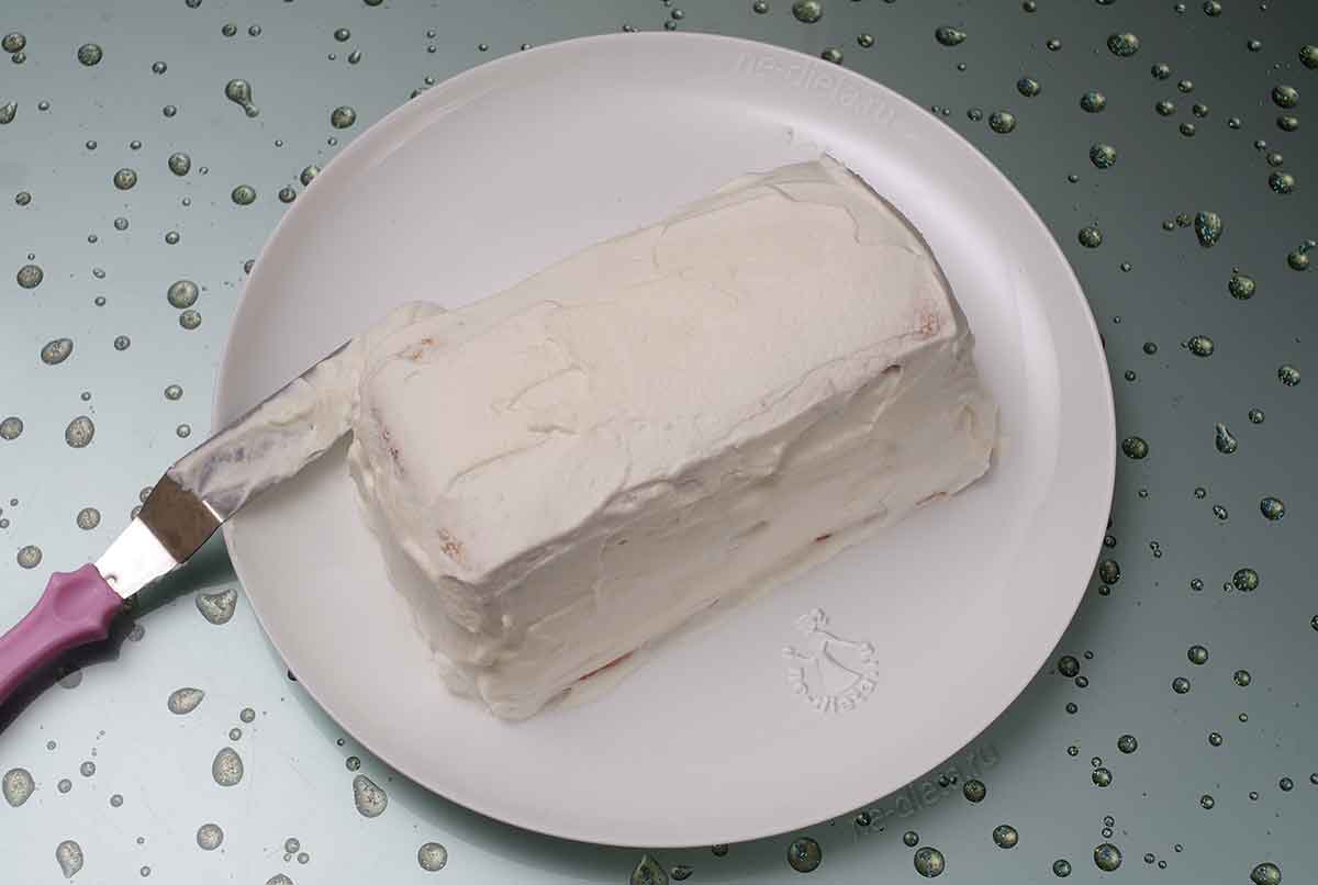 12. После того, как три коржа будут собраны вместе, торт надо обильно смазать сливками сверху и с боков.