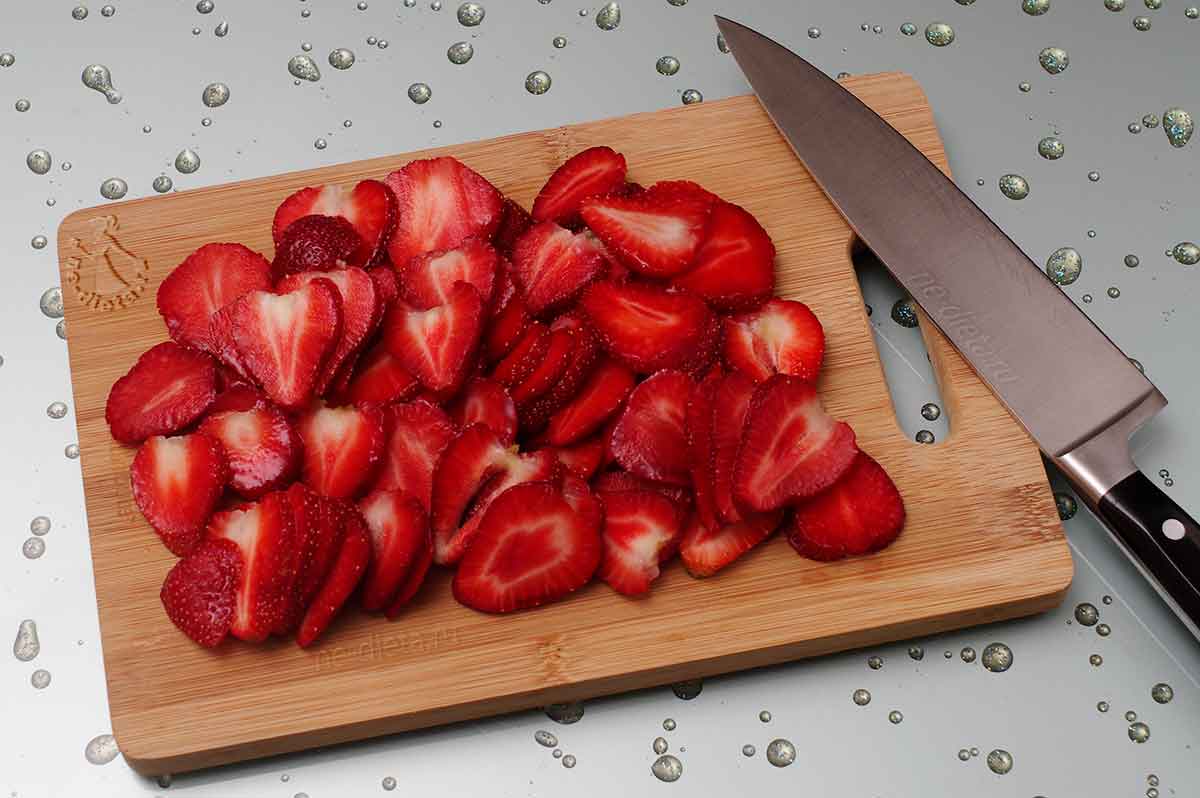 10. Клубнику вымыть и обсушить, после чего очистить от хвостиков и зарезать тонкими пластинками.