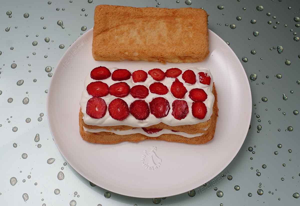11. При формировании торта каждый бисквитный корж следует обильно смазать взбитыми сливками и прослоить ломтиками клубники.