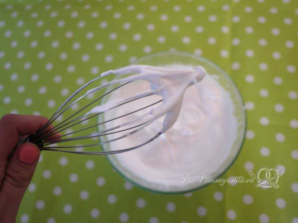 - Взбивать белки нужно до 《жестких пиков》. Если после взбивания поднять венчик и белки будут стоять уверенно, то вы добились нужного эффекта.