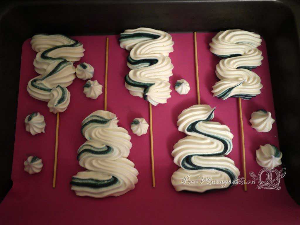 На противень выкладываем подготовленные шпажки и выдавливаем на них меренги необходимой нам формы. Открытое пространство можно заполнить обычными безешками.