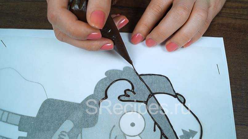 Перелить шоколад в кондитерский мешок, сделать контур и дать шоколаду застыть.