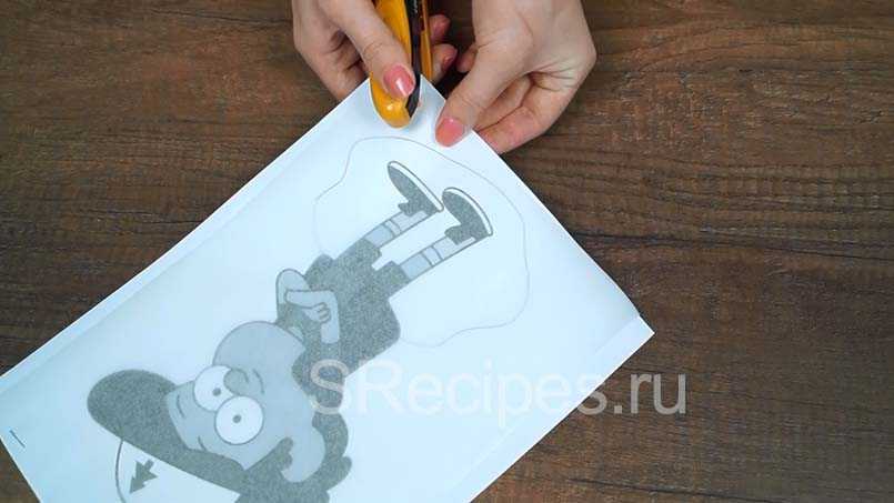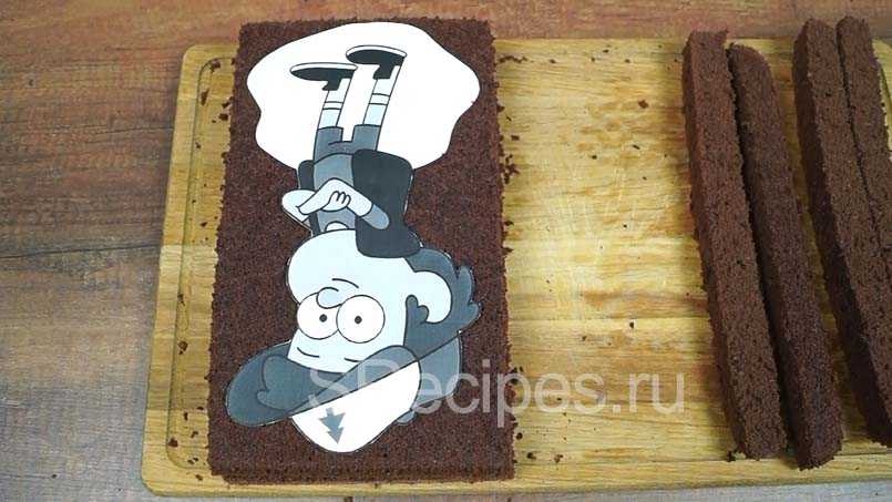 С бисквитов срезать корочку, затем перевернуть и снять пергаментную бумагу. Положить один корж на другой, приложить картинку Диппера и отрезать по бокам ненужные части.
