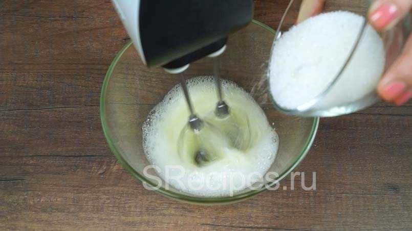 - С помощью миксера взбейте на высокой скорости яйца. Для того чтобы облегчить процесс взбивания, а тесто сделать более воздушным и пористым, добавьте в яйца щепотку соли или каплю лимонного сока.
