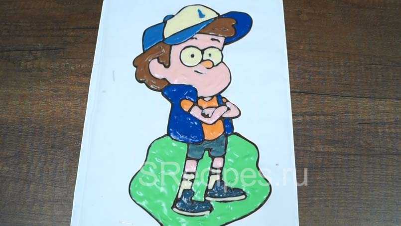 Сверху положить второй корж и слегка прижать. Приложить вырезанную картинку Диппера, только она должна быть зеркальной по отношению к шоколадной картинке, закрепить ее зубочистками и вырезать по контуру с помощью острого ножа.