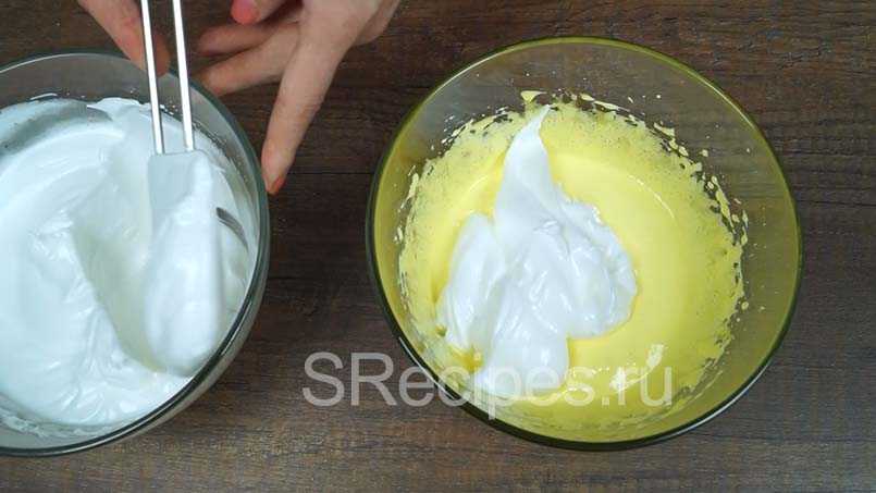 В желтковую массу добавить примерно 1/3 часть белков и перемешать.