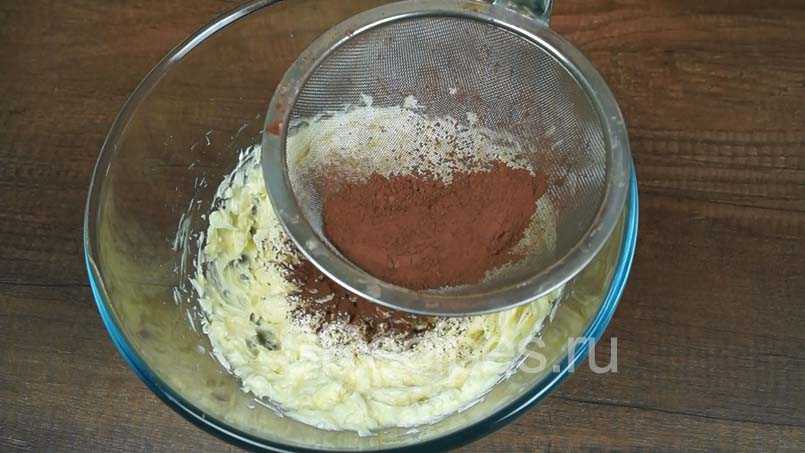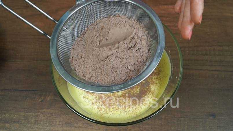 Затем, просеивая добавить муку с какао и хорошо перемешать. Добавить оставшиеся белки и так же хорошо, но аккуратно перемешать.