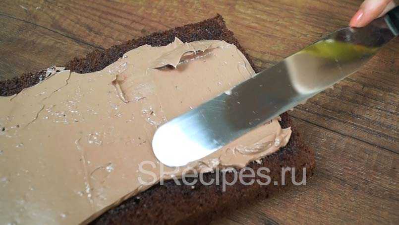 Нанести на один корж чуть меньше половины крема и равномерно распределить.