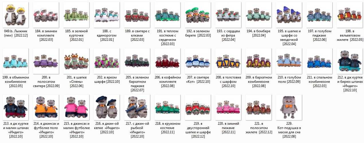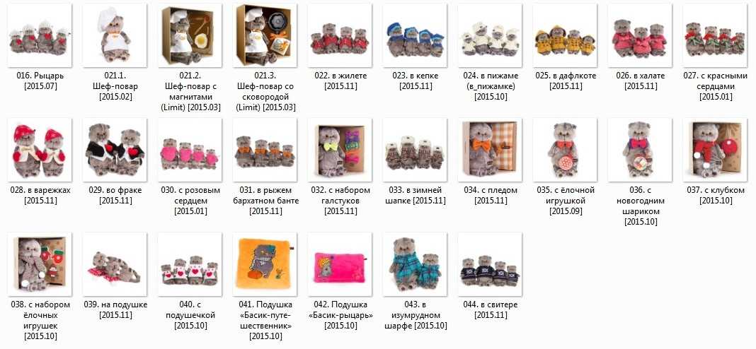 016. – Басик Рыцарь – {19,22,25,30}021.1. – Басик Шеф-повар – {19,22,25,30}021.2.* – Басик Шеф-повар с магнитами (Limit) – {22}021.3.* – Басик Шеф-повар со сковородой (Limit) – {25}022. – Басик в жилете — {19,22,25,30}023. – Басик в кепке — {19,22,25,30}024. – Басик в пижаме (в пижамке) — {19,22,25,30}025. – Басик в дафлкоте — {19,22,25,30}026. – Басик в халате — {22,25,30}027. – Басик с красными сердцами – {19,22,25,30}028. – Басик в варежках — {25,30}029. – Басик во фраке — {25,30}030. – Басик с розовым сердцем – {19,22,25,30}031. – Басик в рыжем бархатном банте – {19,22,25,30}032. – Басик с набором галстуков — {25,30}033. – Басик в зимней шапке — {19,22,25,30}034. – Басик с пледом — {25,30}035. – Басик с ёлочной игрушкой — {25,30}036. – Басик с новогодним шариком — {25,30}037. – Басик с клубком — {25,30}038. – Басик с набором ёлочных игрушек — {25,30}039. – Басик на подушке — {18,26}040. – Басик c подушечкой — {19,22,25,30}041. – Подушка Басик-путешественник