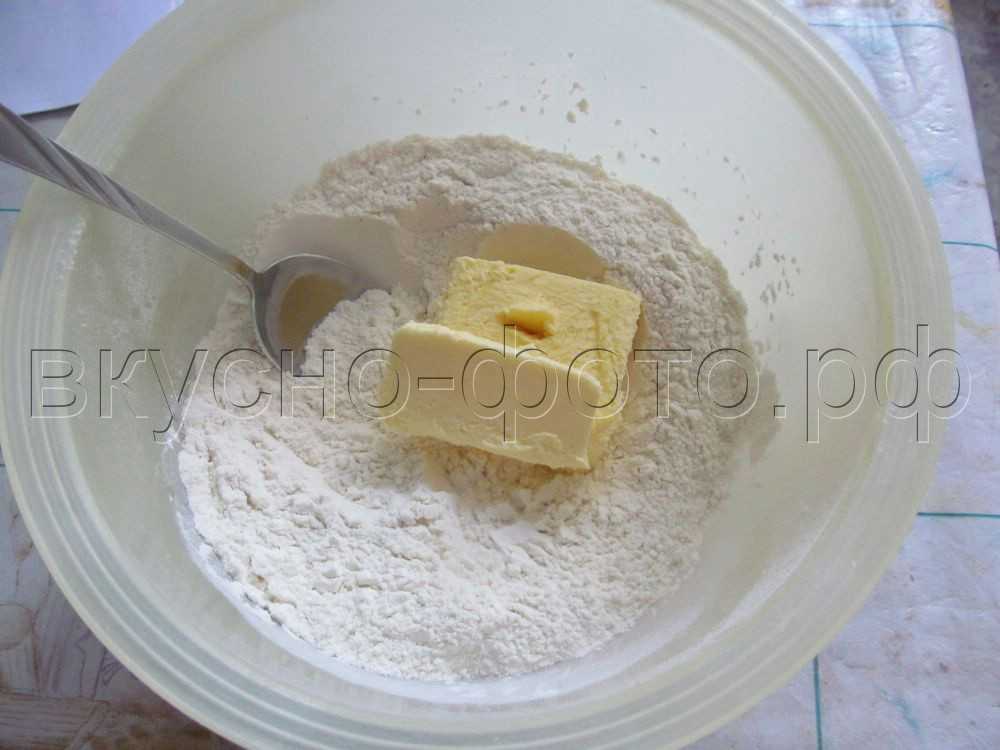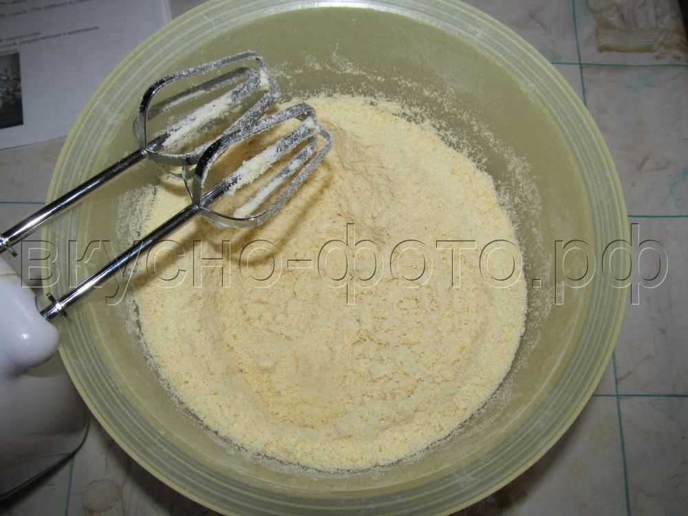 Миксером перемешиваем масло с мучной смесью до получения мелких жирных крошек.