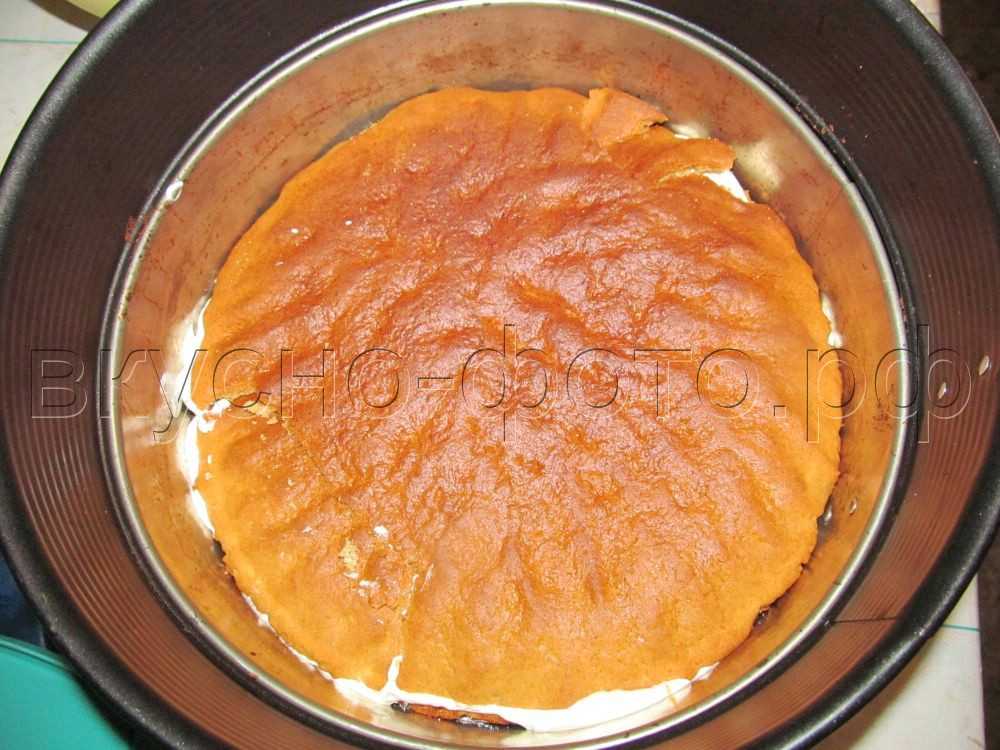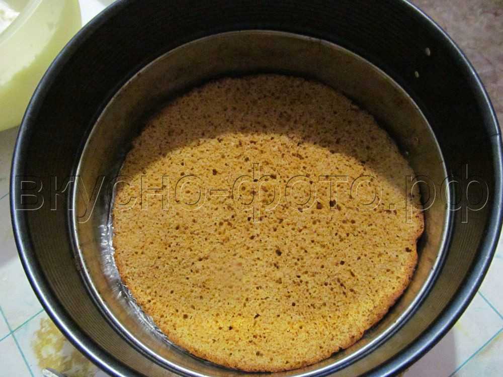 Итак, на дно подготовленной формы или кастрюли кладем один корж.