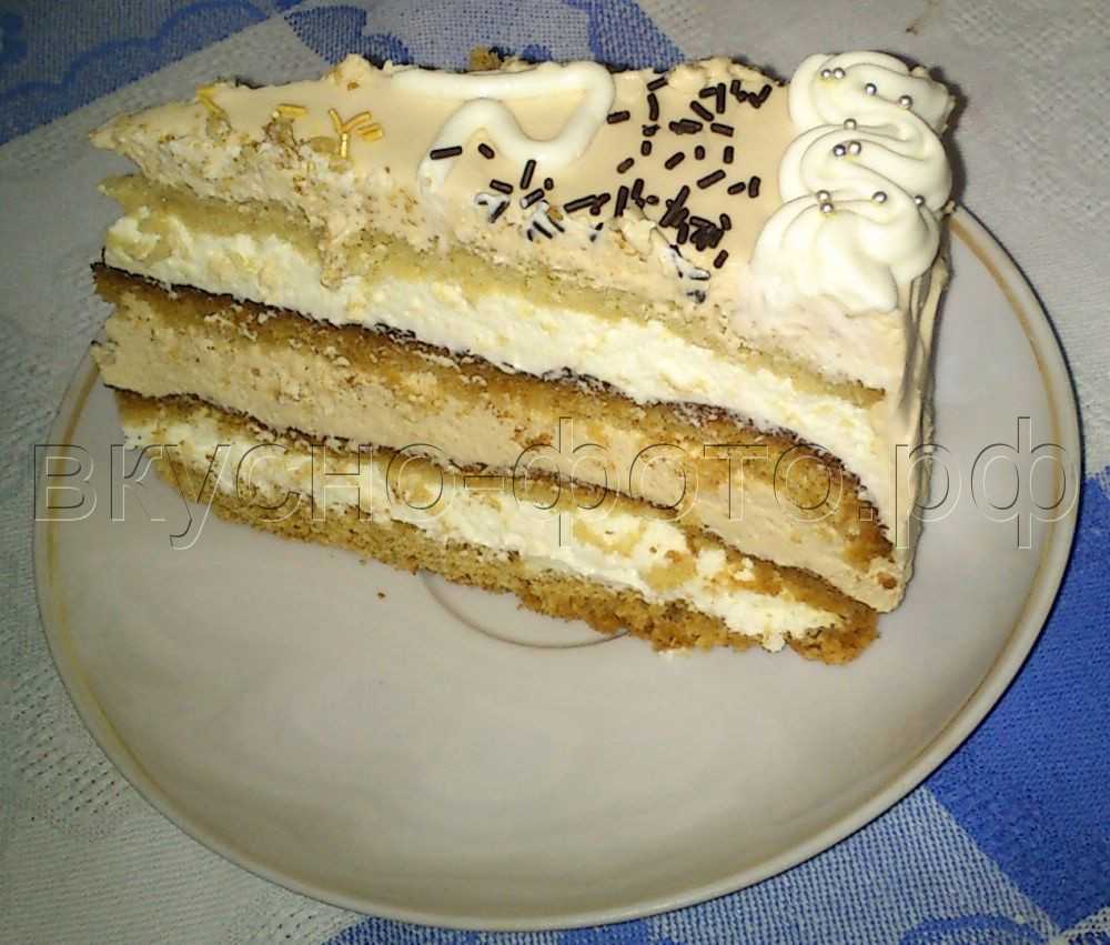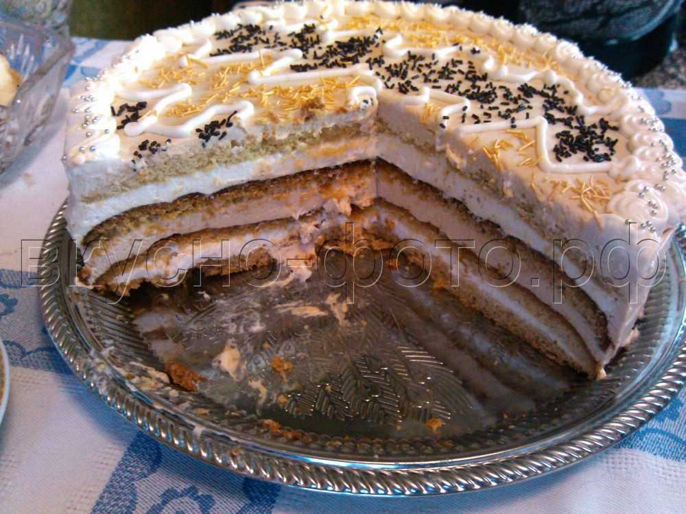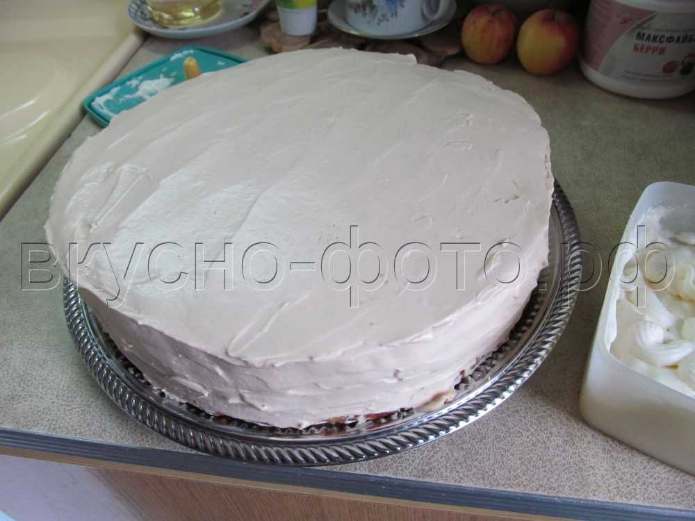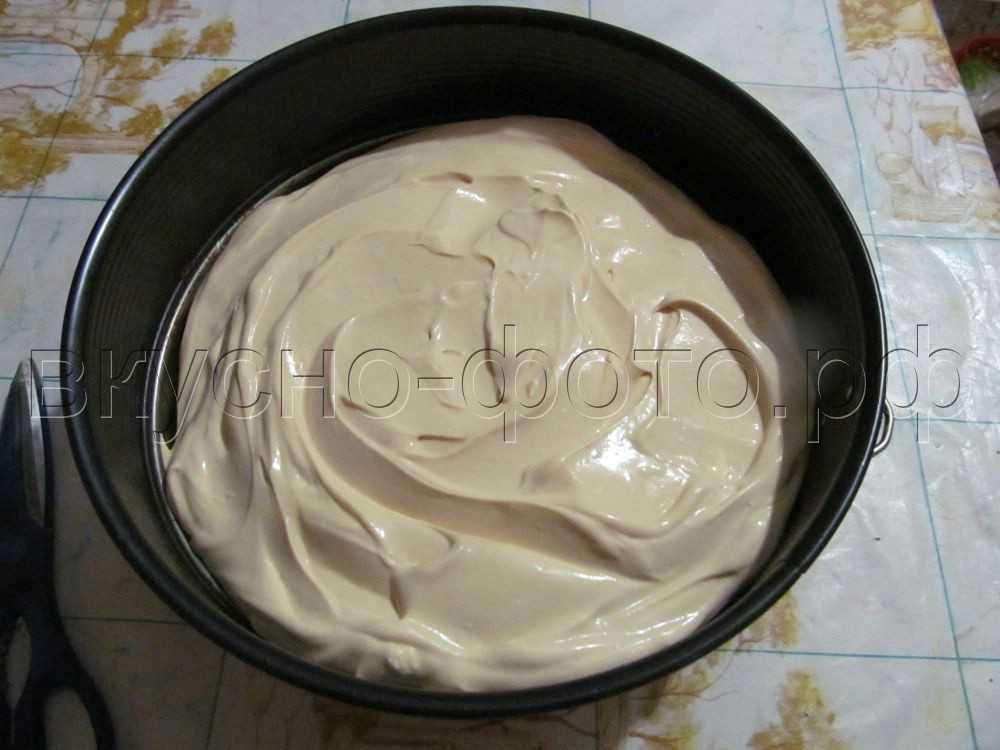 Затем повторяем чередование коржей и кремов. Так как я начинала с белого крема, верхним у меня оказался темный крем (с вареной сгущенкой). Немного белого крема я отложила для украшения торта. Ставим форму с тортом на ночь в холодильник для пропитывания.
