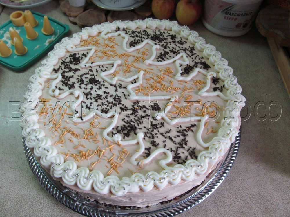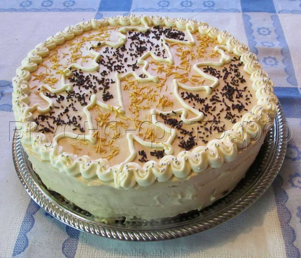 А уже сверху украсила оставленным белым кремом и кондитерскими посыпушками. При желании торт можно обсыпать тертым шоколадом или молотыми орехами.