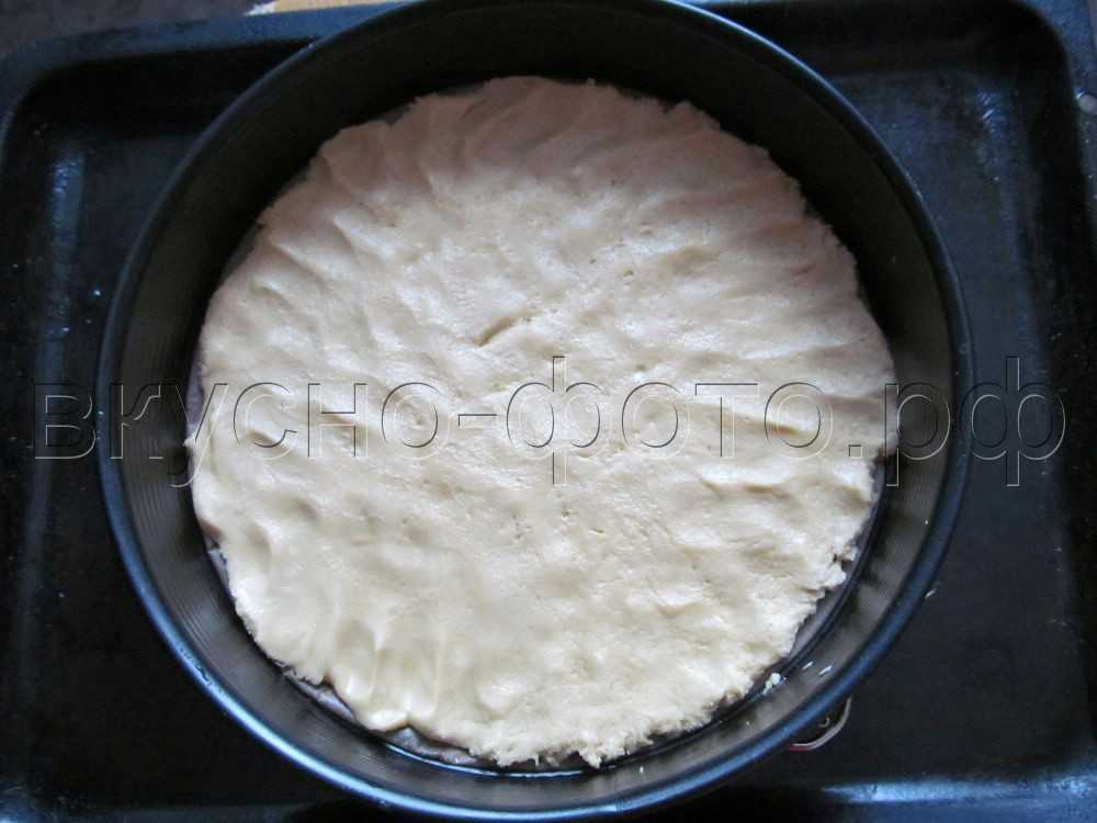 На дно формы диаметром 22-24см положить кружок бумаги для выпечки, выложить половину теста и разровнять.