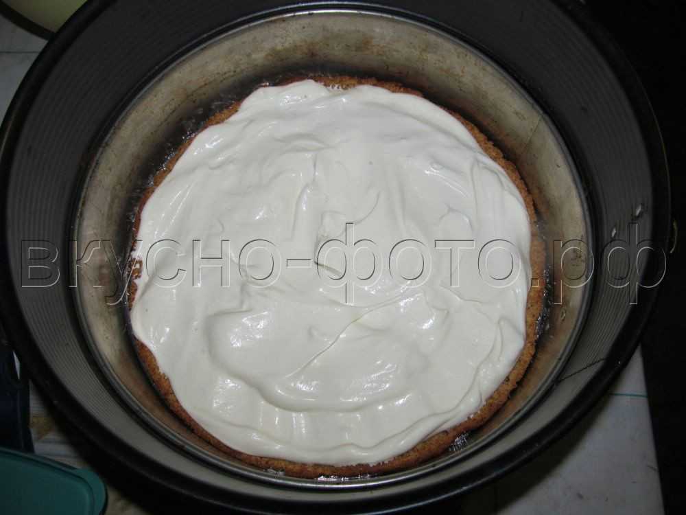 С готового торта снимаем форму (мне это оказалось сделать проще простого благодаря разъемной форме). Или достаем его из кастрюли, потянув за фольгу. Перекладываем на подходящее по размеру плоское блюдо. Бока торта можно обмазать отложенным кремом. Так как верхний слой крема был очень толстый, то я ножом сняла часть крема и им обмазала бока. Получился тортик с ровной поверхностью.