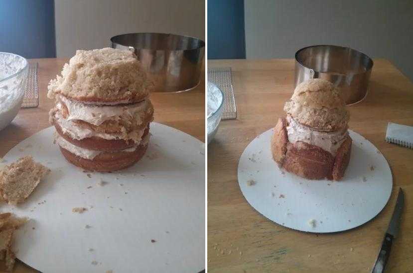2. Затем я обрезаю верхнюю часть, чтобы сформировать голову кота. Последний корж большего диаметра я использую в качестве наполнителя для тех частей тела кота, которые получились недостаточно пышными. Все обрезки бисквита я использую как материал для моей «скульптуры», орудуя ножом и пальцами. В качестве склеивающей массы использую крем из сливочного сыра.