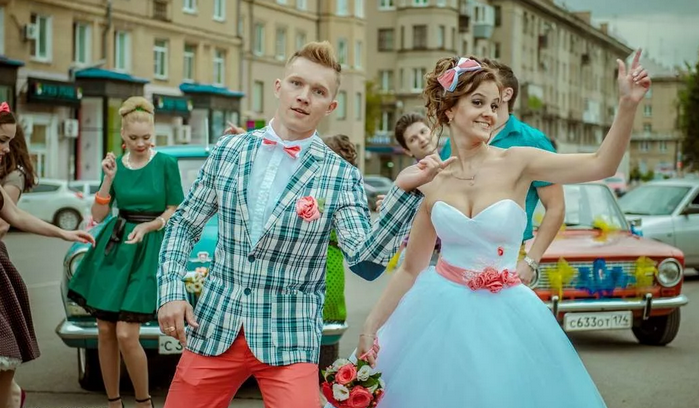 Молодожены – главные герои тусовки. Их одежда на свадьбе в стиле «стиляги» должна выглядеть ярко и неординарно и в то же время не сливаться с пестрой толпой разодетых гостей. Образы влюбленных такие, словно они вот-вот пустятся в зажигательный пляс.