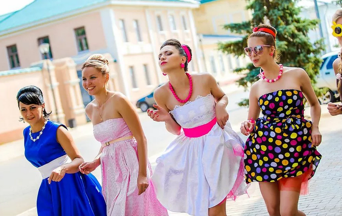 Девушки – в ярких недлинных платьях прямого кроя или с расклешенными юбками. Подруги невесты могут использовать в образах цветовые акценты, выбранные виновницей торжества. Например, если в платье невесты присутствуют цветные детали в виде пояса, туфель или бижутерии, подруги могут надеть однотонные платья таких цветов. Можно подчеркнуть приближенность к невесте и деталями – прическами, обувью, клатчами. Обсудите это заранее.