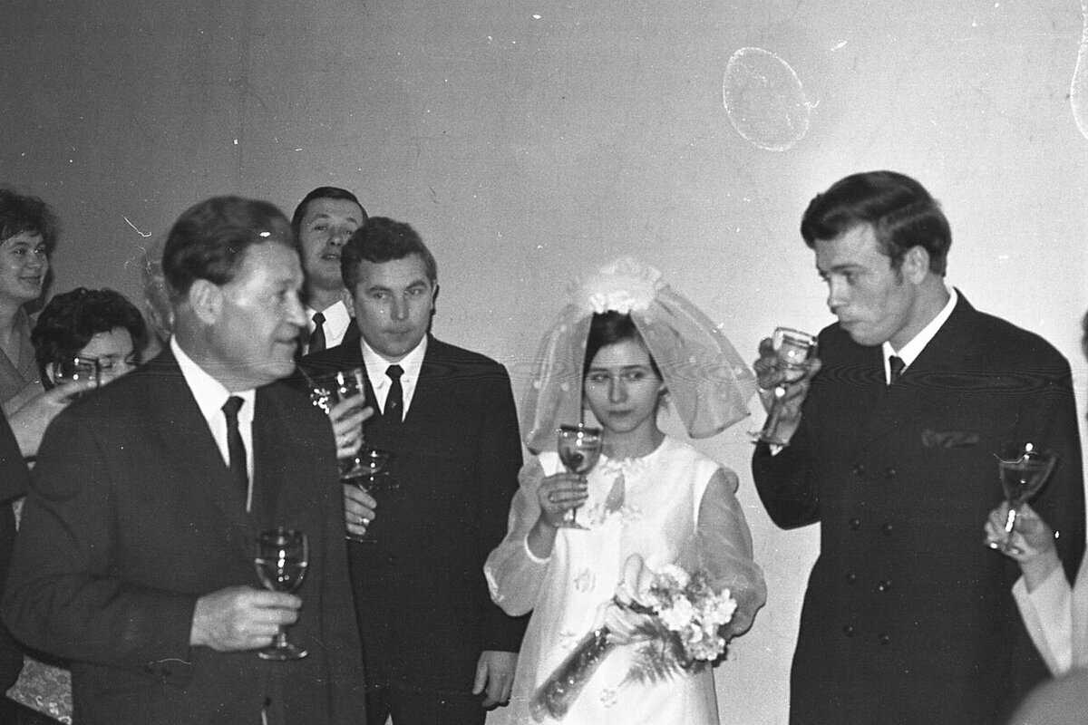 Что касается свадебных нарядов, то и в 70-ые годы им уделяли особое внимание. Традиционно жених и невеста были демонстративно выделены среди участников церемонии