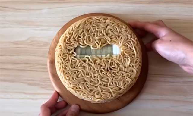 Готовую вермишель соединяем с приправами, что входят в упаковку. (6:28) Небольшой сотейник смазываем маслом. По центру устанавливаем емкость с денежной рулеткой. Вокруг укладываем лапшу.