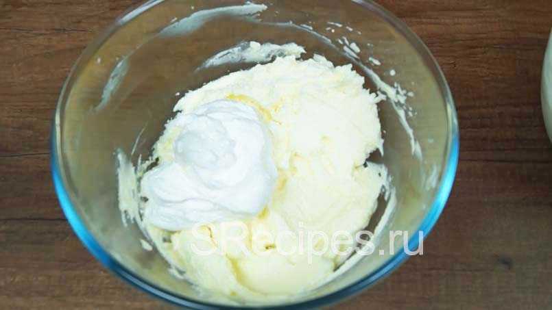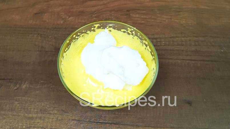 Белки взбейте с оставшимся сахаром в плотную пену. Переложите взбитые белки в желтковую массу и аккуратно перемешайте.