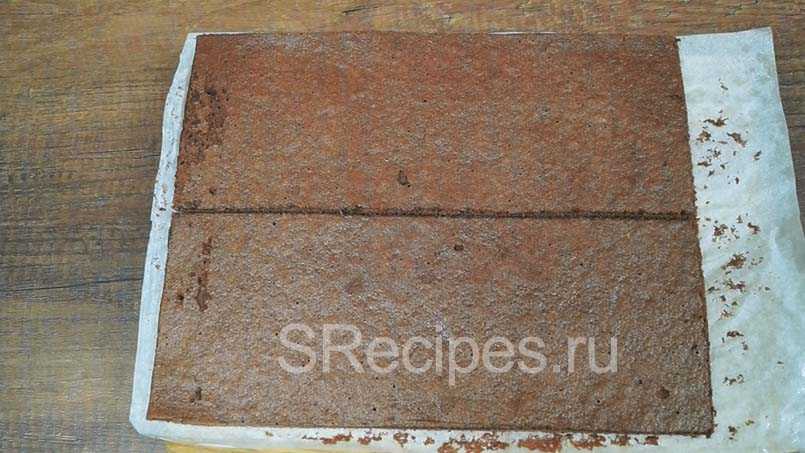 Ставим бисквит для Киндер Пингви в предварительно разогретую духовку до 180 градусов и выпекаем 10-15 минут или пока вставленная в центр зубочистка не выйдет сухой. Достаем бисквит из духовки, даем полностью остыть и вырезаем два прямоугольника длинной 30 см и шириной 12 см.