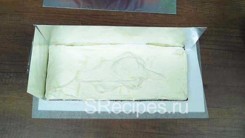 Из обеих половинок бисквита вырежьте одинаковые прямоугольники. Я взяла специальную прямоугольную форму без дна. На доску, подходящего размера, положите пленку или пергамент, установите форму и выложите один бисквит.