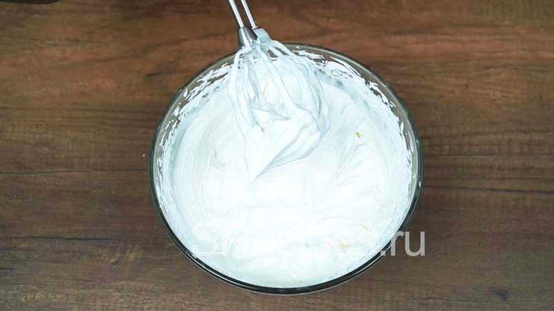 Отделяем белки от желтков. Белки взбиваем в пену, постепенно вводим сахар, и продолжаем взбивать до устойчивых пиков.