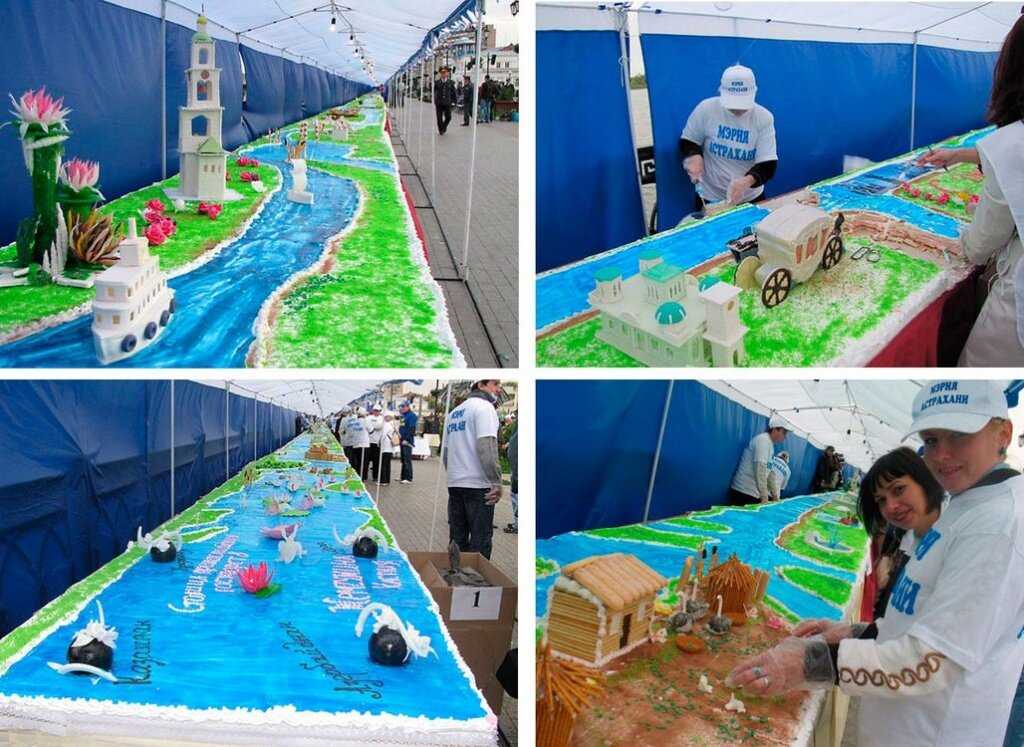 Торт «Волга» получился 247 м, 17 см. в длину, а весом 8,247 тонн. Местные власти для приготовления этого шедевра привлекли кондитерские фабрики, а чтобы украсить его уже на месте, пригласили 30 кондитеров. В целом на приготовление сладкой вкусности ушла одна неделя. «Волга» – символ России был отправлен в Книгу Гиннеса.
