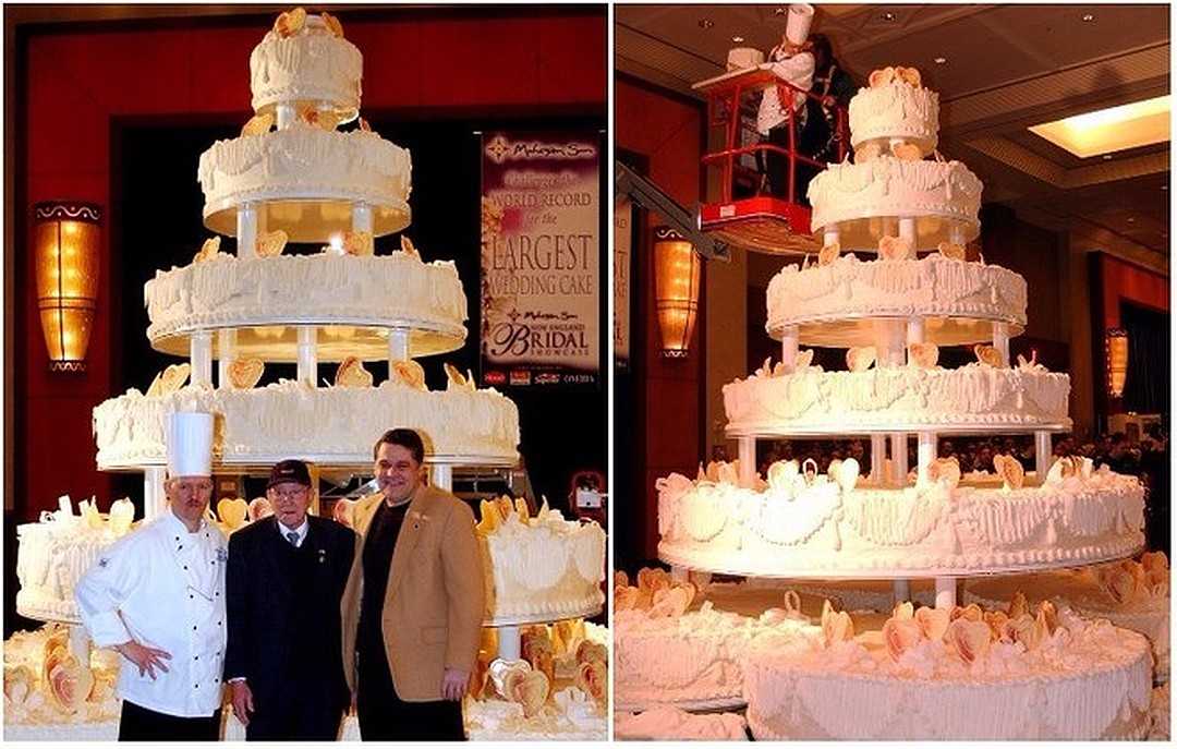 Настоящий фурор произвел свадебный торт, созданный пекарями американского городка Анкасвилл в 2004 году. Цель его создания – новая страница в Книге Гиннеса. Это произведение кулинарного искусства представляло собой 7 ярусов, общей массой 6 тонн 800 кг. Почти 7 тонн гастрономического удовольствия – это 4,5 тонны бисквита, свыше 2 тонн крема, килограммы глазури. Его декором занималось 58 кондитеров на протяжении трех суток.