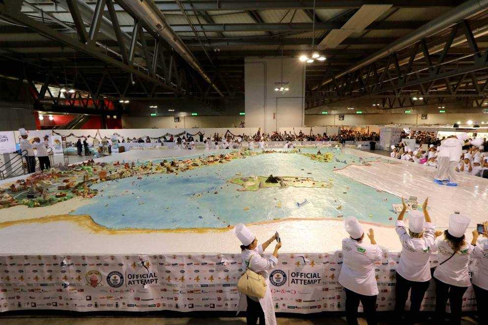 В 2015 году удивили мир итальянские кулинары, которые испекли торт весом в 1 тонну и габаритами 16,5*14 метров.