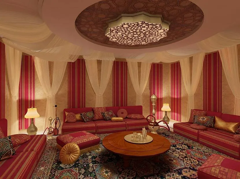 «Король» зоны отдыха – огромный диван. Для удобства и комфорта накладывается большое количество подушек. Обивка всегда гладкая, приятная на ощупь, сочных оттенков. Перед диваном устанавливают широкий, низкий столик. На него можно поставить кальян и угощение. Такой же предмет мебели можно поставить в столовой.