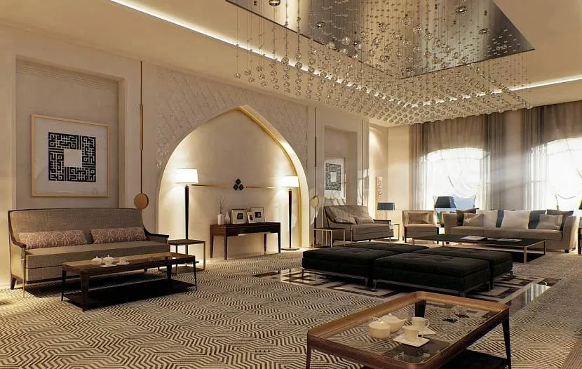Восточный интерьер отличается плавными, мягкими формами с нанесенной на них росписью. Потолок может быть подвесным, иметь несколько уровней, популярно использование декоративных накладок с разнообразной имитацией.