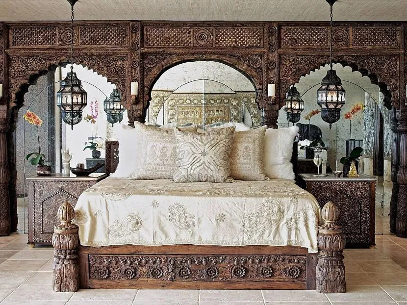 Предметы интерьера из темного дерева, украшенные резьбой, смотрятся дорого и стильно, подчеркивают статус хозяина. Восточный стиль должен быть пропитан атмосферой богатства.