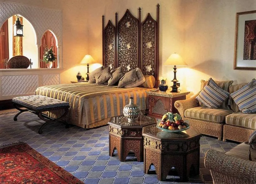 Мебель для восточного интерьера должна быть функциональной, для арабского стиля подойдут породы темного оттенка, для китайского направления можно использовать бамбук. Форма может быть абсолютно любой, украшением служит резьба, разнообразные вставки, покрытие золотом. Восточный интерьер ассоциируется с роскошью и богатством, в нём должно быть немного мебели, не стоит размещать в жилом помещении ненужные предметы интерьера, которые будут сжимать пространство и перегружать оформление.