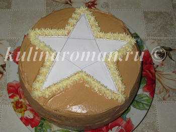 6. Украсила я торт красной звездой. А приготовить её очень просто. Для этого берём клубничное желе, отсыпаем приблизительно 20 гр. из пакета и засыпаем его в 60 мл. горячей воды. Тщательно перемешиваем, чтоб растворились гранулы желатина. Но такой объем растворенного фруктового желе быстро схватывается, поэтому его приготовьте, когда нарисуете вот такую звезду. Её я рисовала масляным кремом (сгущенка и слив. масло). После чего бумагу нужно удалить.