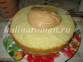 Разделить приготовленный крем на две части и одну из них намазать на первый корж.