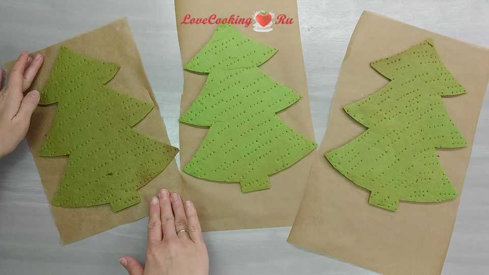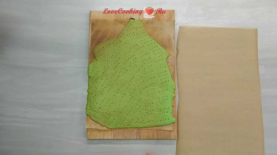 - Корж аккуратно переложить елочку на противень, наколоть его вилкой и испечь при 180 градусах в течение 7-8 минут. Выпечку не пересушивать! Всего должно получиться 3 елочки.