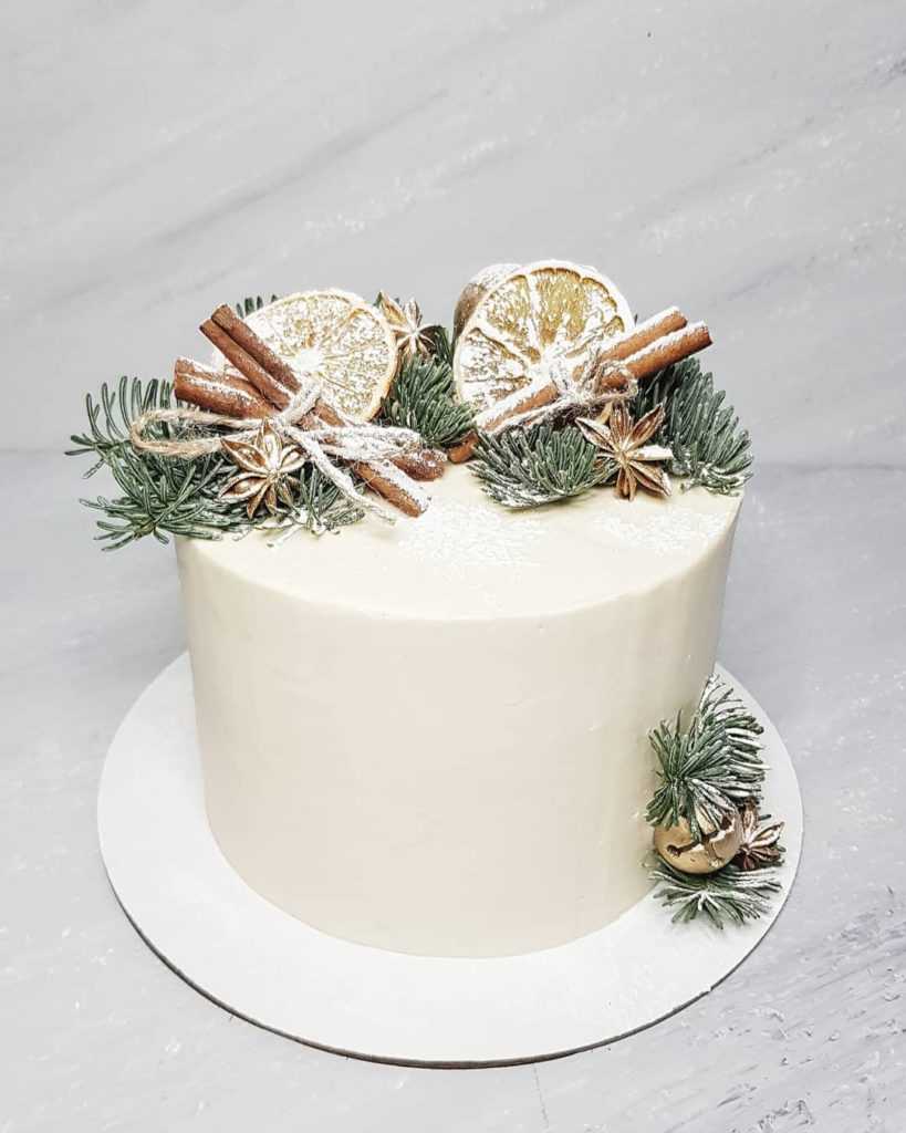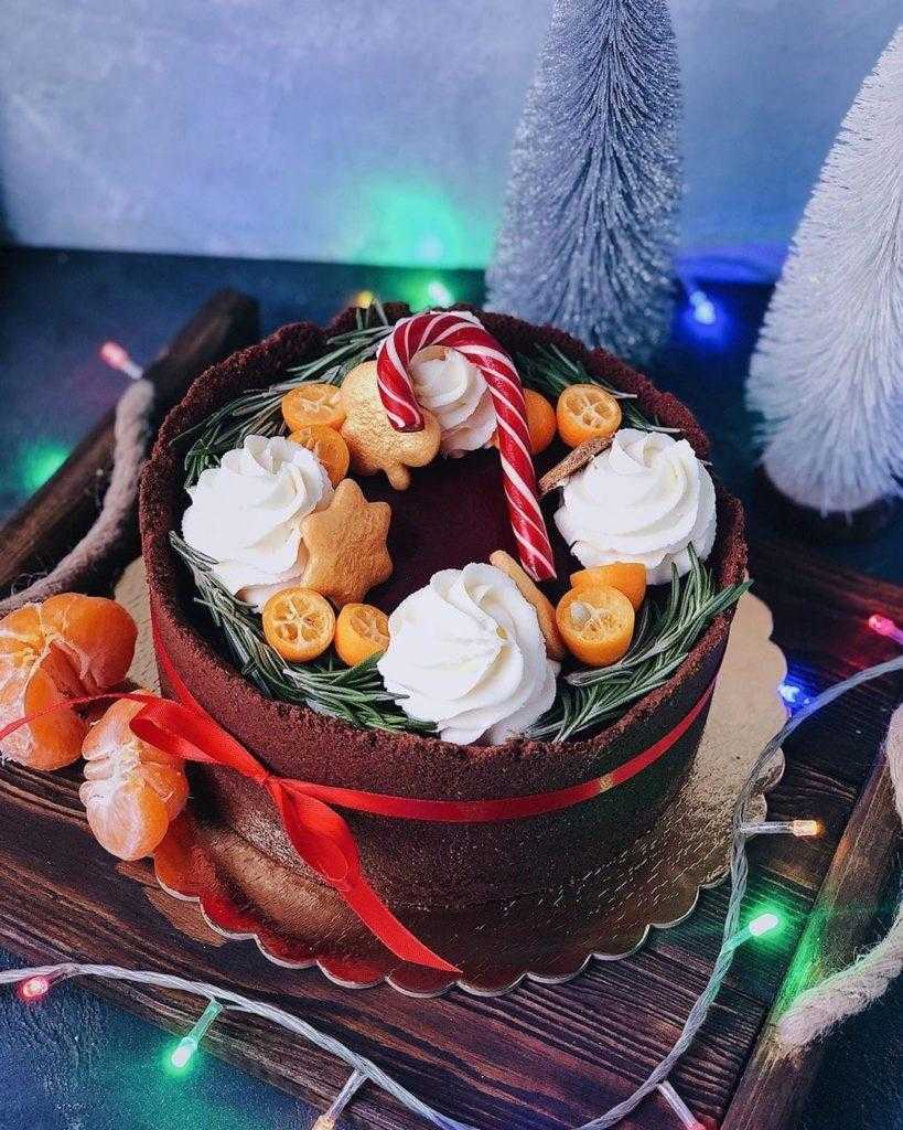 И еще один большой плюс этих тортов – любое оформление. Такие торты оформляются меренгой, кремом, мандаринами, корицей, сушенными апельсинами и даже шишками. Кстати, эти же элементы декора можно сочетать при декорировании обычных тортов.