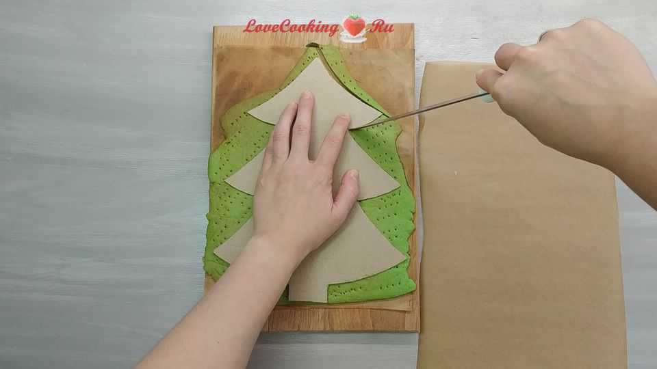 - Охлажденное тесто раскатать на присыпанной мукой поверхности в пласт толщиной 3 мм. Затем из него вырезать корж в форме елочки по трафарету, сделанному из листа бумаги формата А4.