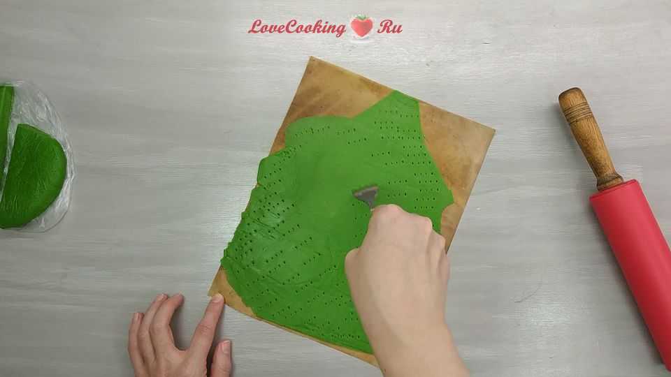 Делим тесто на 3 части. Тонко раскатываем по размеру ёлки на коврике для выпекания. Накалываем вилкой.