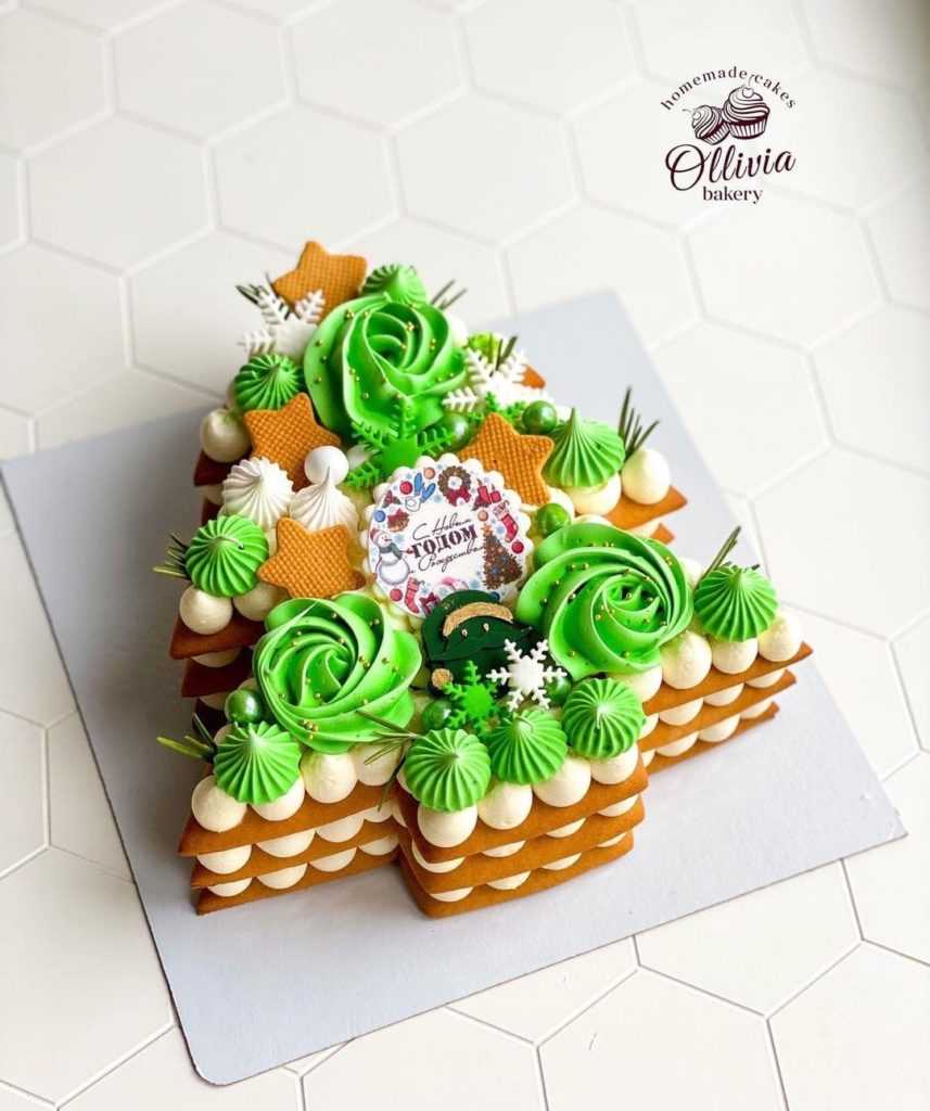 - Сверху накладывается второй корж. Технология создания елочки – аналогичная на каждом этапе.