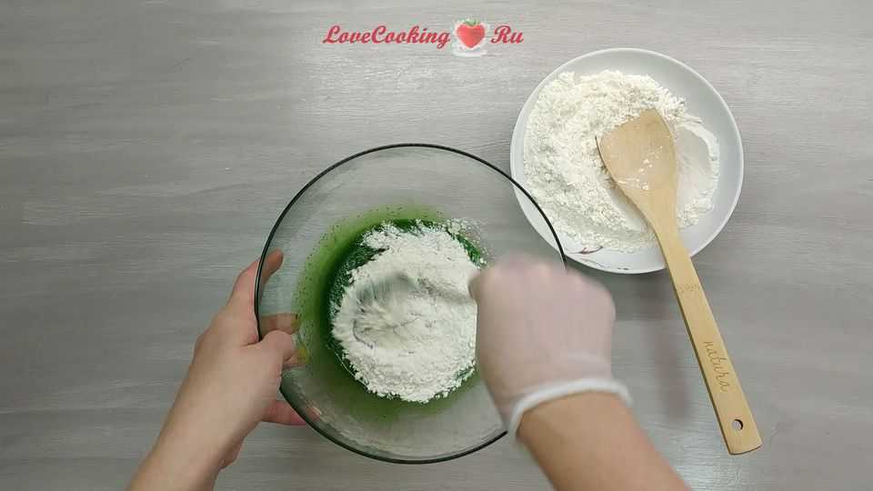 Поэтапно вводим муку. Замешиваем тесто. Оно будет слегка липнуть к рукам.