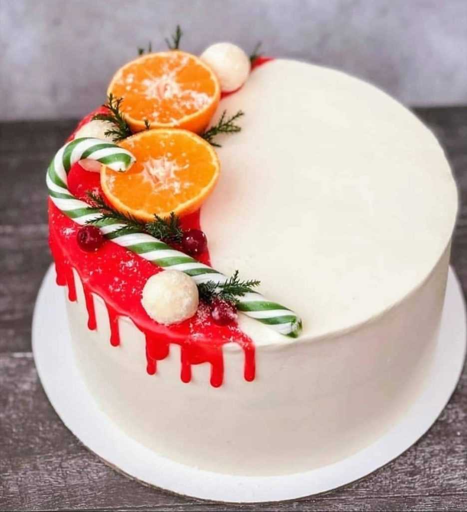 В декоре новогоднего торта можно использовать, то, чего мы так пытаемся избежать. Мандарины, апельсины, разрезы фруктов, гранат. В новогоднем декоре эти элементы уместны. Апельсин можно подсушить, как в предыдущем варианте декоре, можно использовать очищенный мандарин, а можно его карамеллизировать.