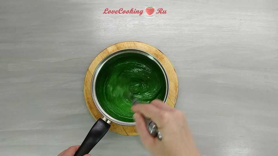 - Когда смесь станет однородной и начнет закипать, ее нужно снять с огня, всыпать соду и размешать. Содержимое кастрюльки начнет пениться и подымиться. После этого заварную основу нужно остудить до комнатной температуры.