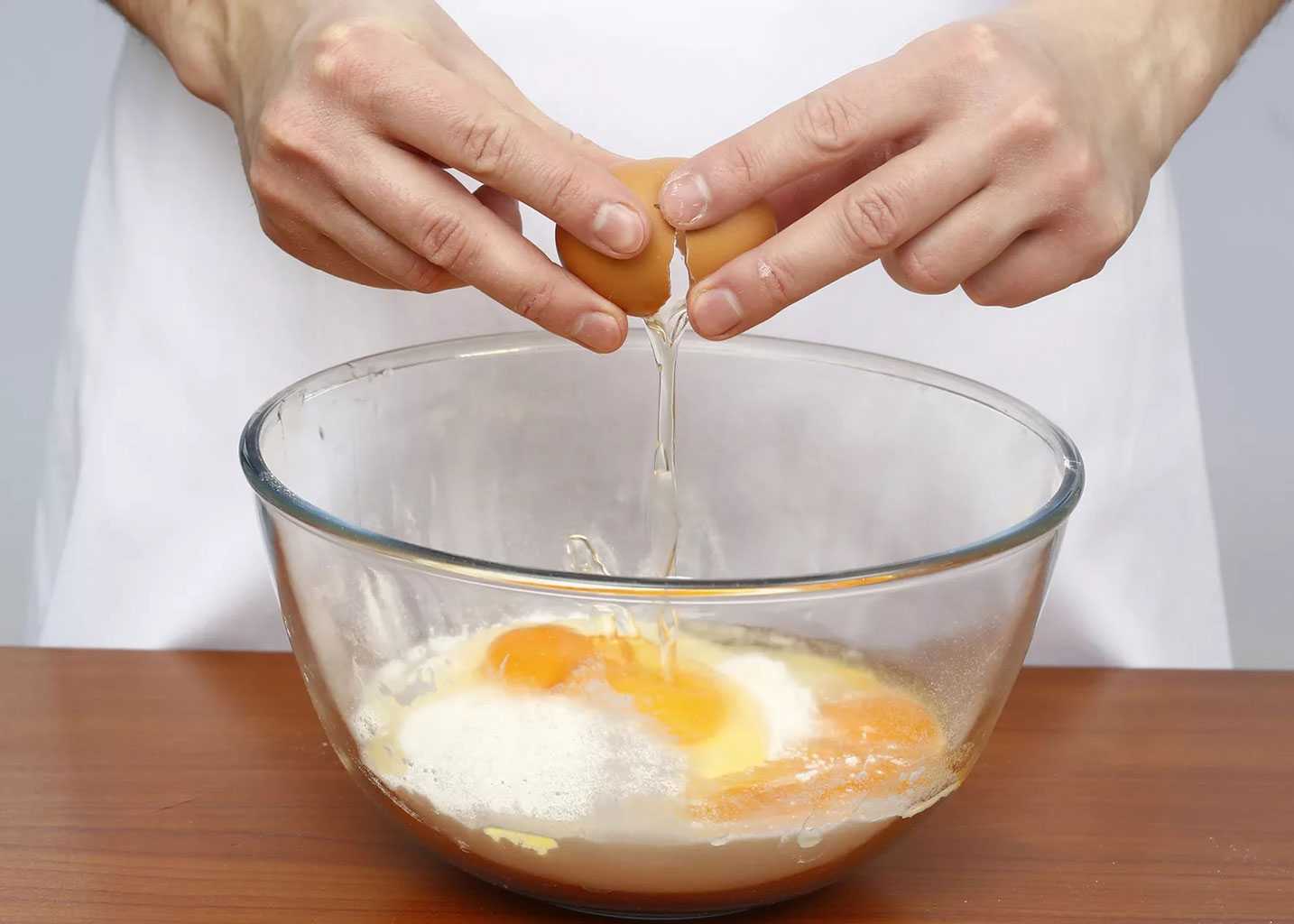 - В походящую емкость разбить яйца и добавить в них половину указанного количество сахарного песка.