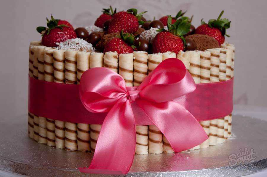 - Печеньем или батончиками плотно обложите бока торта по всему периметру, так у вас получится имитация корзинки. Можете дополнительно обвязать их атласной ленточкой, так торт приобретет праздничный вид.